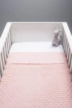 Het laken past met 120×150 in het ledikant. Er is ook afmeting 100 x 75 cm verkrijgbaar; die past goed in een wieg en in de kinderwagen.