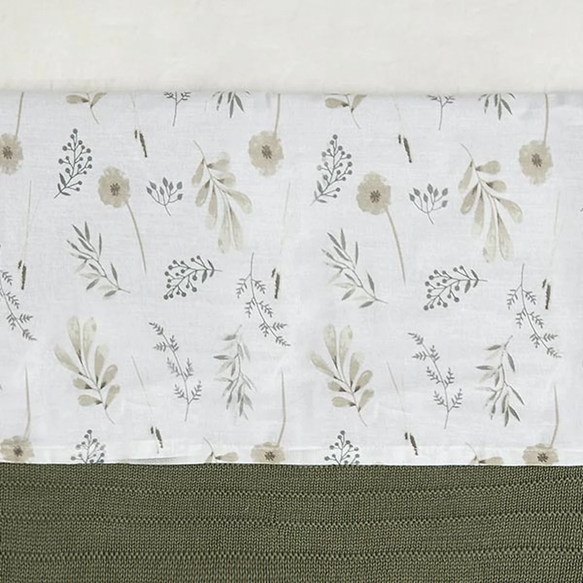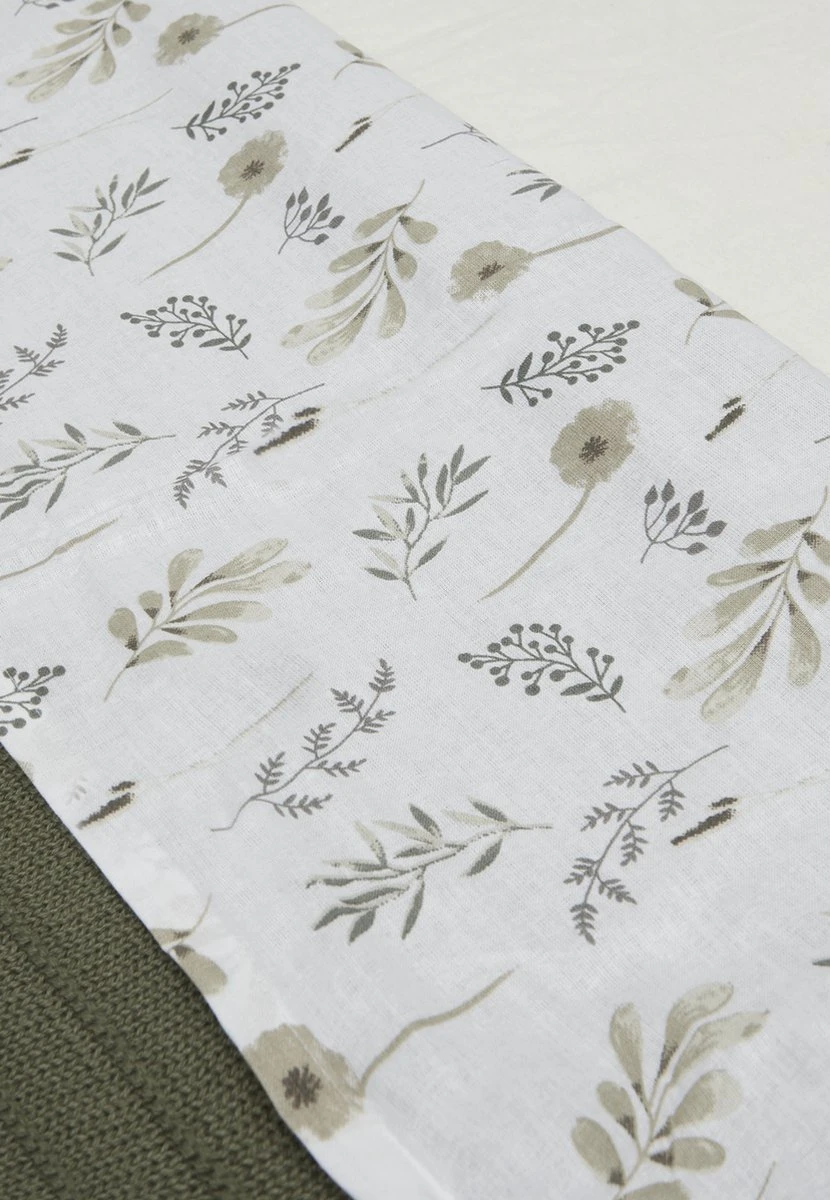 Het witte lakentje heeft een opdruk met droogbloemen in pastelkleuren