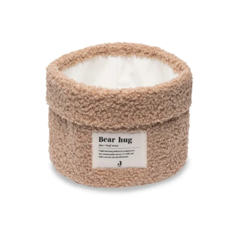 Praktische mand gemaakt van zachte bakstof Bouclé, perfect voor het opbergen van losse spullen. De mand is 14 cm hoog, met een diameter van 18 cm. Op de voorkant van de mand staat het leuke ‘bear-hug’ logo. Deze mand is super praktisch om op de commode te zetten, om kleine verzorgingsspullen zoals een manicureset, een borstel en een thermometer in op te bergen. En tegelijkertijd is het een perfect item om wat sfeer toe te voegen aan de babykamer. Met deze opbergmand houd je de lades van de kaptafel netjes. Een mand voor sokken, voor verzorgingsproducten en voor babyslofjes. Het ziet er ook nog eens heel stijlvol uit op de kaptafel! Het is ook erg praktisch in de woonkamer, voor klein speelgoed. Je kunt deze kaptafelmand ook combineren met de grote opbergmand Bouclé.