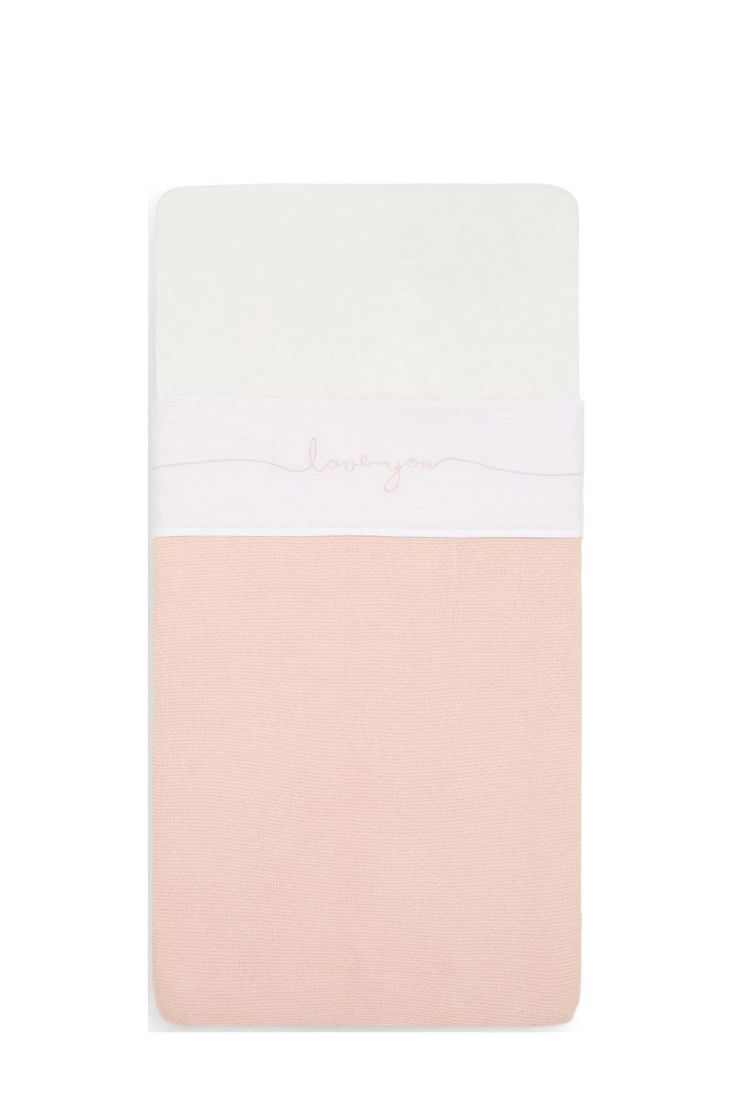 Met een wit lakentje kun je het bedje van jouw baby veilig, kort en strak opmaken. Door de zijkanten van het lakentje onder het matrasje te stoppen, slaapt jouw kleintje niet alleen veilig, maar heeft het ook een geborgen gevoel. Dit lieve lakentje met de tekst ‘love you’ past perfect bij de dekens uit het Basic knit thema en het Bliss knit thema van Jollein.