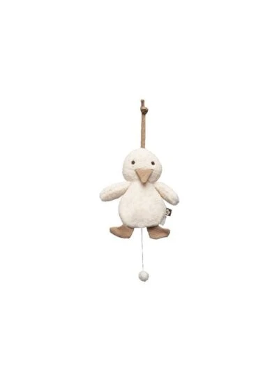 Het lieve eendje heeft een trekkoord en aan de bovenkant zit een touwtje om de muziekhanger op te hangen.
